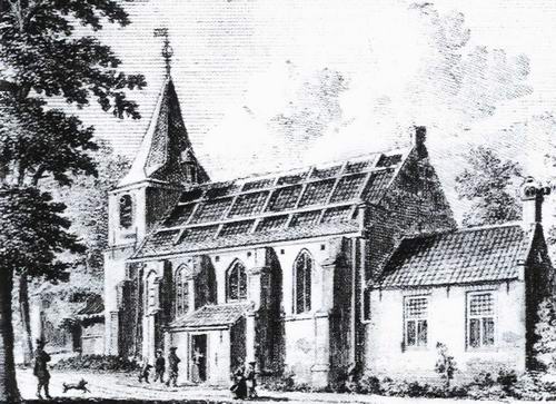 The Reformed Church of Willige Langerak has always had a prominent place in the village community. The stone foundation for the church steeple was laid in 1627. The church in its present state dates from the 18th century. In 1863 the church was rebuilt and in 1893 enlarged. The outside south wall of the present church shows the brick foundation from the early church. Most likely the church building had a lot of damage in the fire of 1672, which destroyed the whole neighborhood of the church and was replaced by a new church building. Below we see a drawing of the church in 1745.